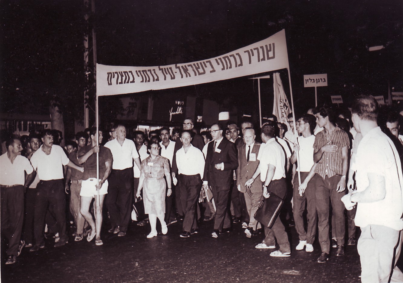בשורה הראשונה צועדים: חיים לנדאו, ד"ר יוסף שופמן, מנחם בגין, חיים לזר, יוסף קלרמן, אסתר רזיאל-נאור.